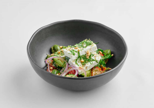 Греческий салат — овощи с сыром фета и оливками, лёгкий и свежий.